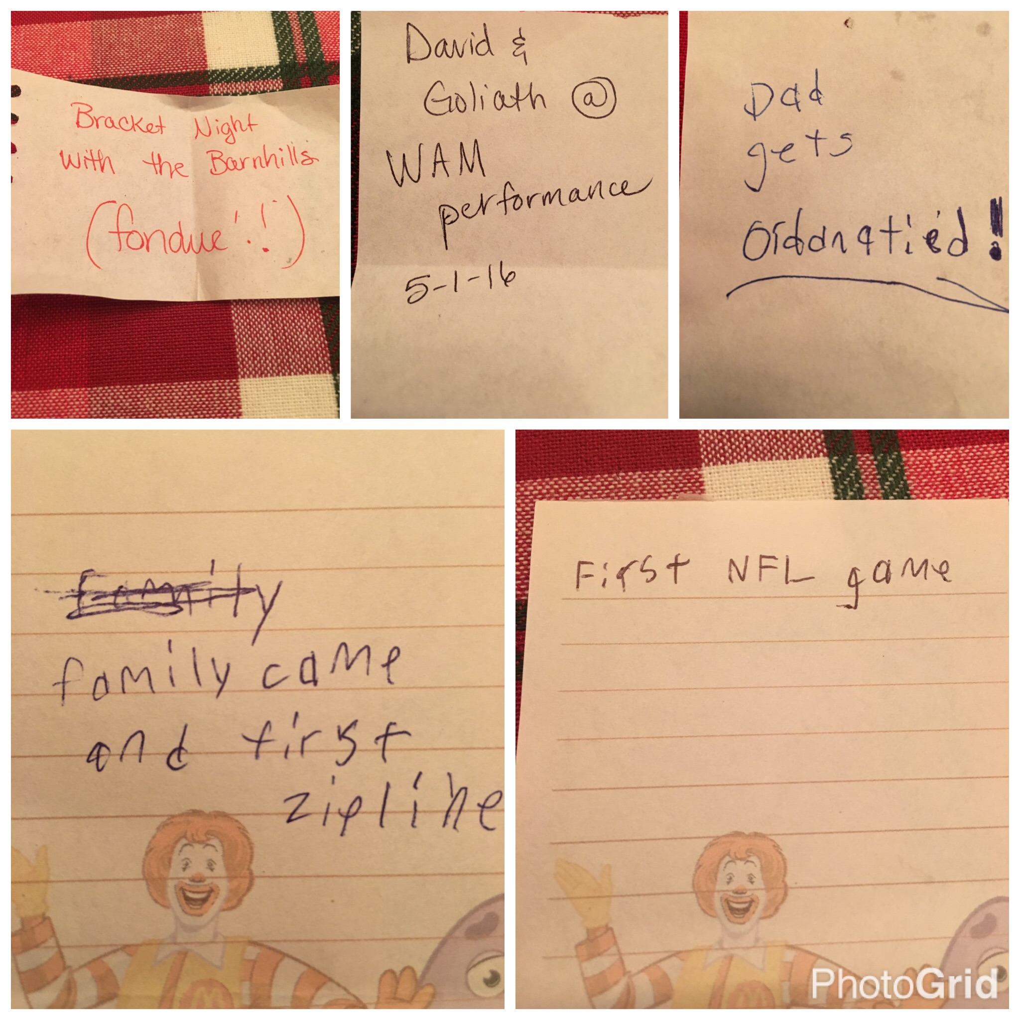 Well tonight at dinner we took turns pulling out a note and reading each memory. I was amazed and impressed with the moments that impacted my family. Of course we had the big events: first NFL game, white-water rafting and zip-lining in New Mexico, and first buck killed. But the majority of the memories mentioned were simple but special: snow cones with friends, block party with neighbors, events at church. This was a great reminder for me that it’s the simple but intentional moments that matter most to my family. And more importantly, this gave us a great opportunity to reflect on God’s blessings this past year.